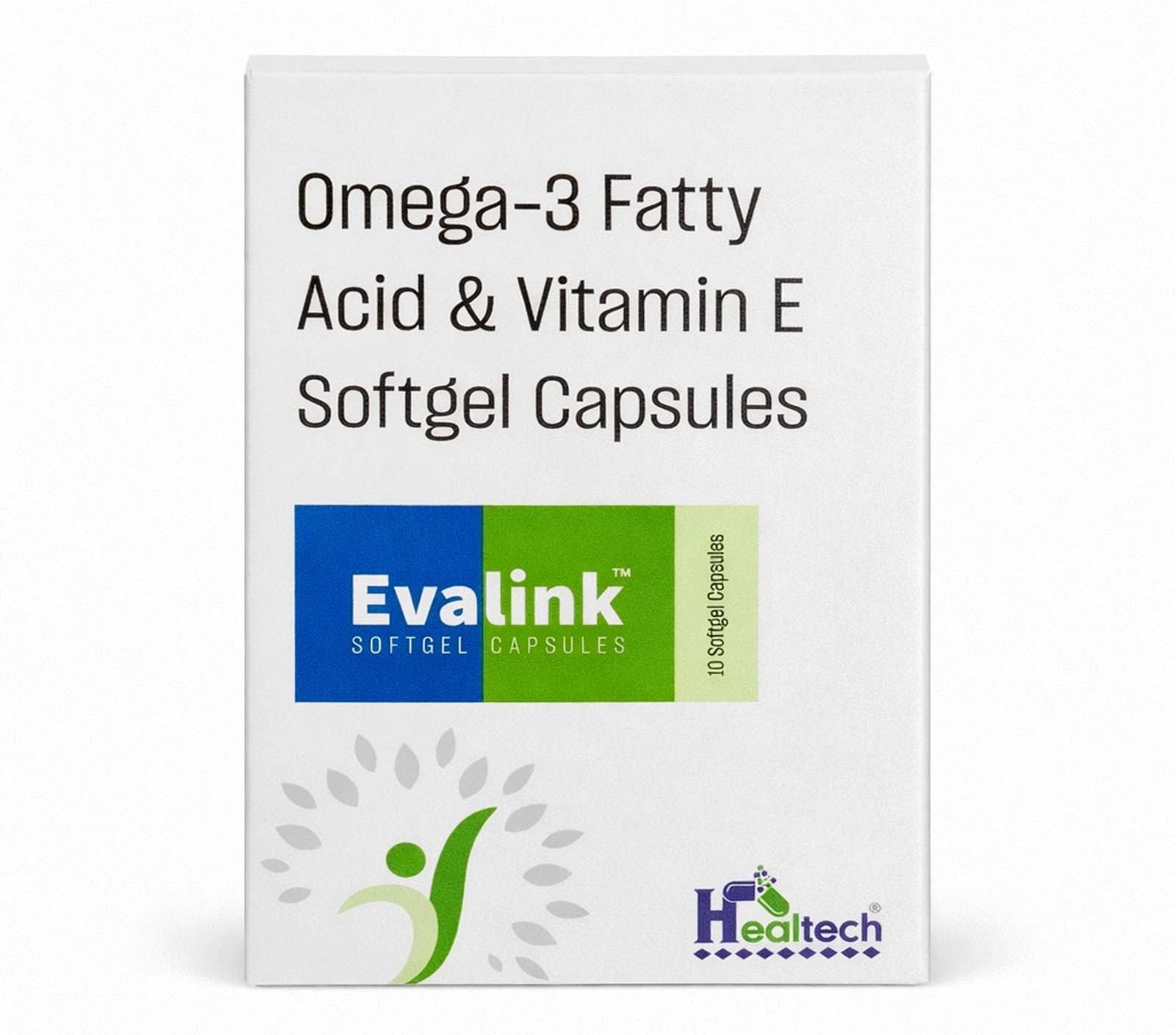 Evalink Softgel Capsules is a quality pharmaceutical product formulated with Omega‑3 Fatty Acid & Vitamin E Softgel Capsules. Marketed by Healtech Pharmaceuticals, it is designed to support effective treatment and nutritional support as prescribed by healthcare professionals.