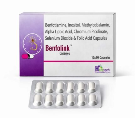 Benfolink Capsules is a quality pharmaceutical product formulated with Benfotiamine, Inositol, Methylcobalamin, Alpha Lipoic Acid, Chromium Picolinate, Selenium Dioxide & Folic Acid Capsules. Marketed by Healtech Pharmaceuticals, it is designed to support effective treatment and nutritional support as prescribed by healthcare professionals.